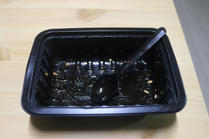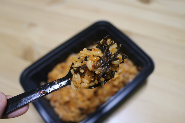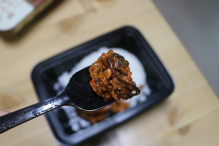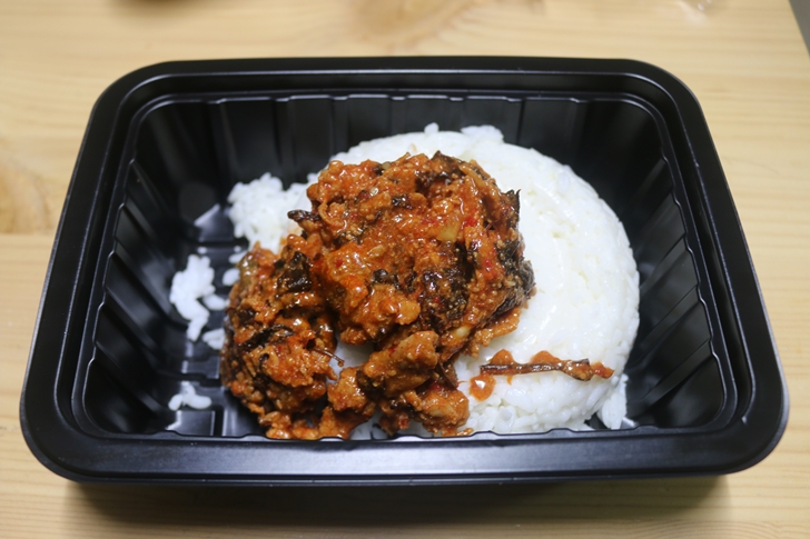 편스토랑 고들빼기 두루치기덮밥의 종이케이스 안에 들어있는 구성품입니다. 따끈한 밥과 고들빼기두루치기, 참기름, 그리고 숟가락이 들어있습니다.