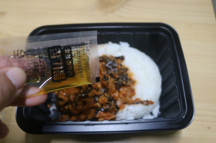 밥과 고들빼기 두루치기 소스(?)를 용기에 넣었습니다. 비닐포장에서 소스를 꺼내는게 좀 힘드네요