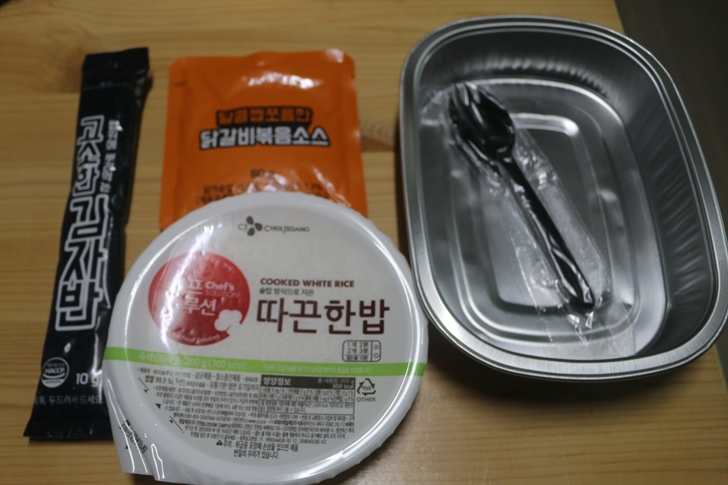 뭐 그래도 직접 먹어봐야 하니 조리를 시작해보겠습니다. 일단 밥을 알루미늄 용기에 넣고 닭갈비 볶음 소스와 잘 비벼질 수 있도록 잘 폈습니다.