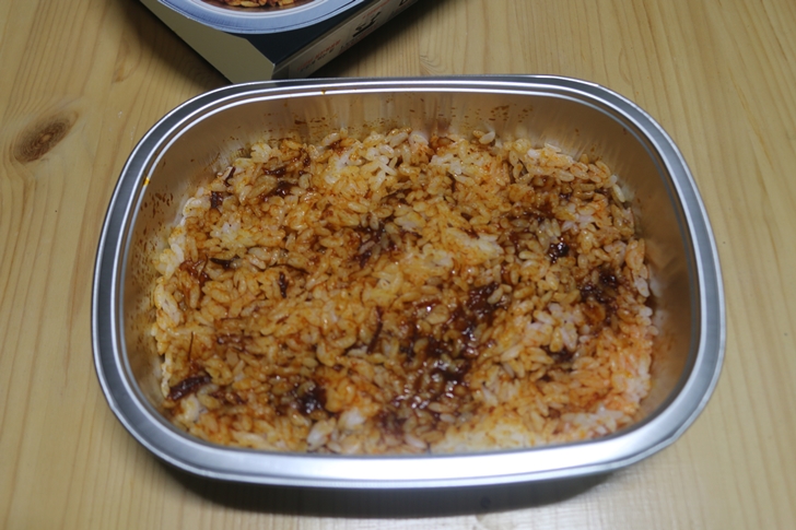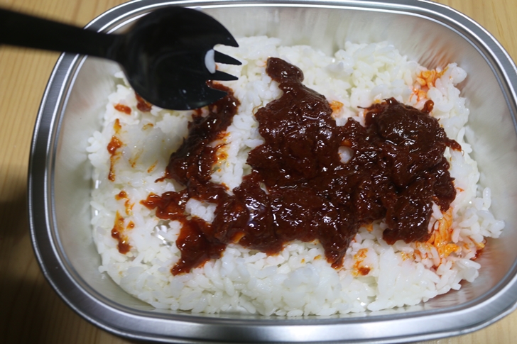 전자레인지에서 꺼내보니 맛은 어떨지 모르겠지만 닭갈비 볶음 소스에 건더기가 거의 없다 보니 솔직히 많이 부족해 보이네요. 겉보기에는 그저 밥에다가 고추장 비벼놓은 것 같은 느낌입니다.