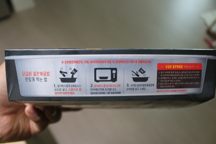 닭갈비 철판볶음밥의 경우 알루미늄 용기이기 때문에 전자레인지에서 조리를 한 경우 뜨겁기 때문에 손으로 만지지 말고 쉽게 꺼낼 수 있도록 종이케이스에 손잡이가 있습니다. 용기가 플라스틱이라도 전자레인지에서 꺼낼 때 뜨거운데 이건 아이디어가 참 좋은 것 같습니다.