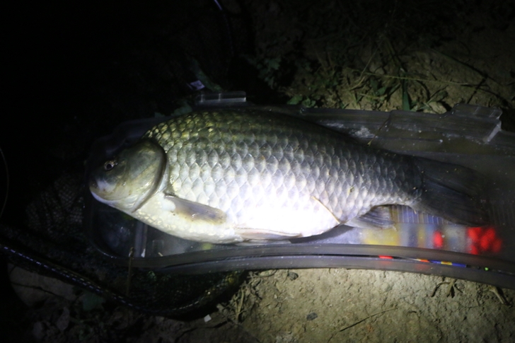 자정이 된 후에 의자에 앉아서 잠을 자다가 두시쯤 깨서 찌를 둘러보고 있는데 제일 좌측의 찌가 천천히 솟는게 보입니다. 아직 잠이 덜 깬 상태에서 잠결에 챔질을 했는데 무언가가 무지막지한 힘으로 끌고가는걸 제압해보니 4짜붕어입니다. 체고만 봤을때는 4짜가 훨씬 넘어보였는데 계측해보니 딱 40cm네요.