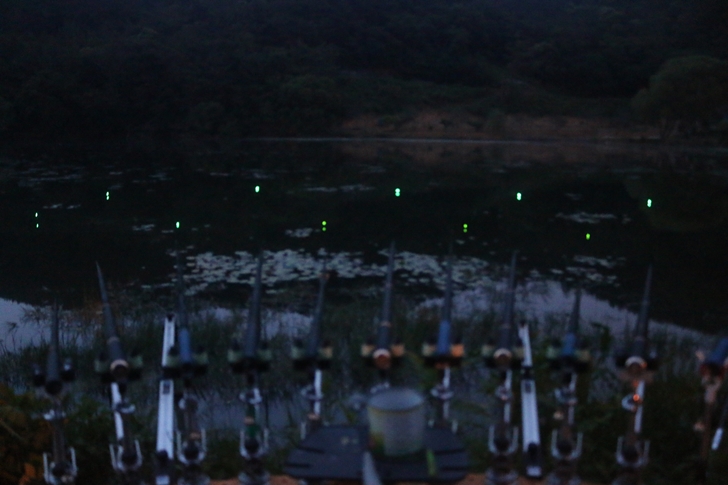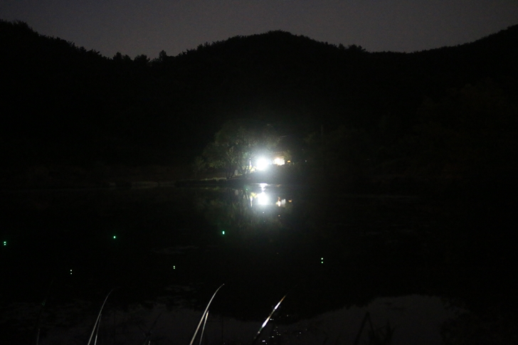 밤낚시를 위해서 케미 불빛을 밝혔습니다. 어두워지니 물고기들이 좀 더 활발하게 움직이는 것 같긴한데 아무래도 물소리를 들어봐서는 배스가 먹이사냥을 하는 것 같습니다.