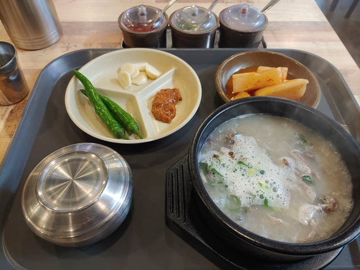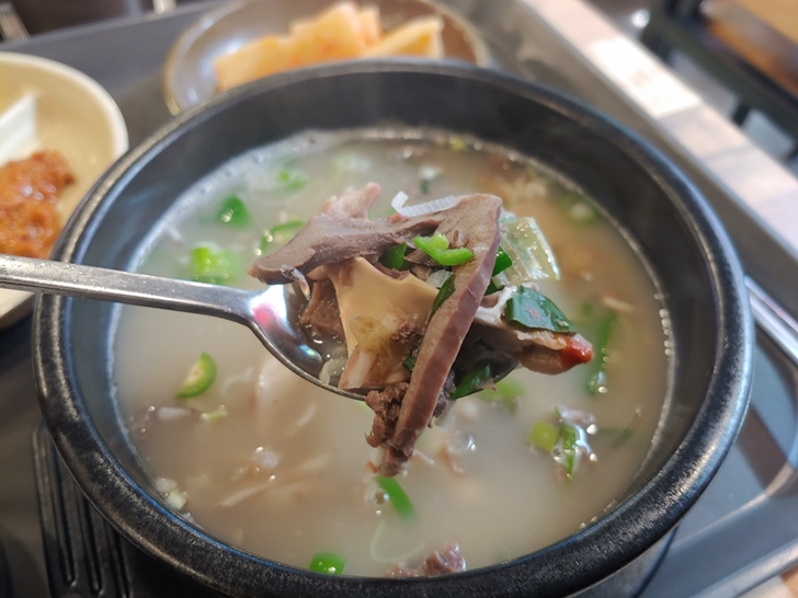뽀얀 국물에서 김이 모락모락 나고 있으며 고소한 순대국밥의 냄새가 코를 자극합니다. 일단 국물부터 살짝 맛보니 제 기준에서는 간을 안 해도 될 정도로 국물이 진하고 좋은데 보통 순대국밥의 국물과는 좀 다른 특별한 매력이 있네요.